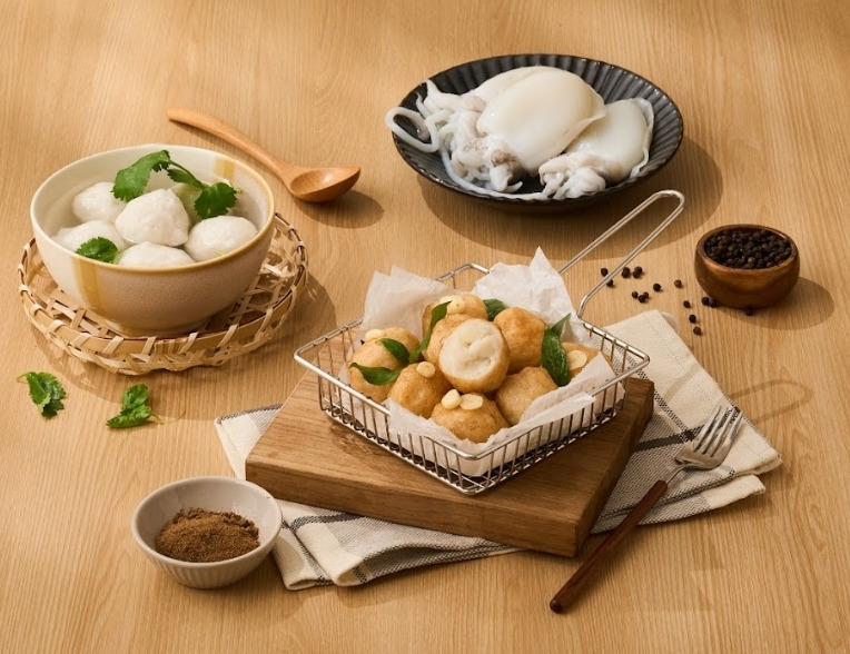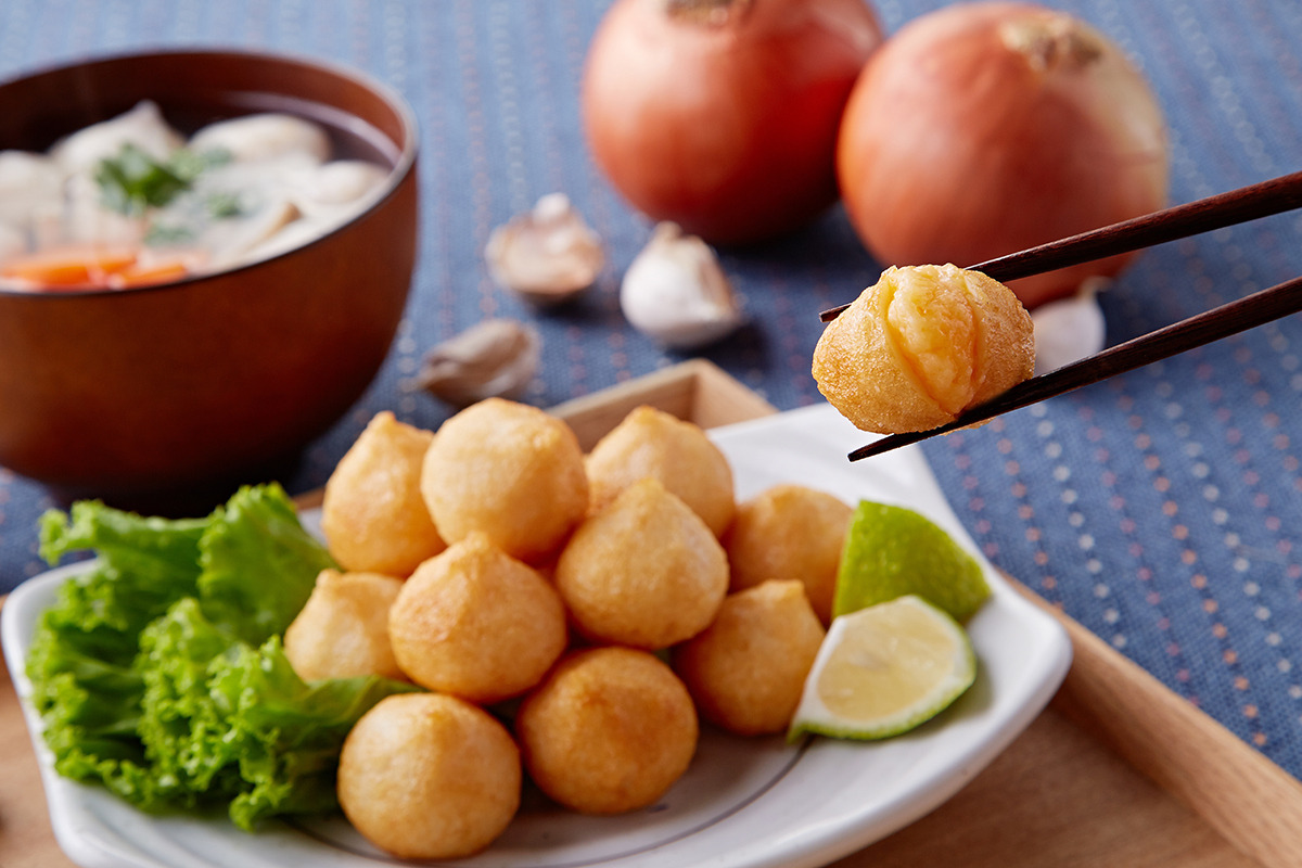 開胃菜的首選! 魚漿中加入魷魚塊,口感層次豐富。可炸可煮,炸後外酥內Q,煮後清甜爽口。